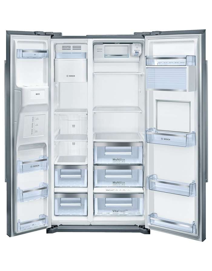 ساید بای ساید بوش مدل kag90aw204 از برچسب انرژی +++A بهره مند است و می توان گفت یکی از محصولات بسیار کم مصرف در سطح بازار ایران می باشد. این دستگاه شامل سیستم یخ ساز و آبریز بوده که می توان آن را بر روی درب دستگاه مشاهده نمود. بسیاری از افراد ممکن است با خود بپرسند این ساید بای ساید قابلیت اتصال به آب شهری را دارد؟ در پاسخ به این سوال باید بگوییم خیر، برای استفاده از ابریز و یخ ساز باید به صورت دستی مخزن آب را پر کنید.